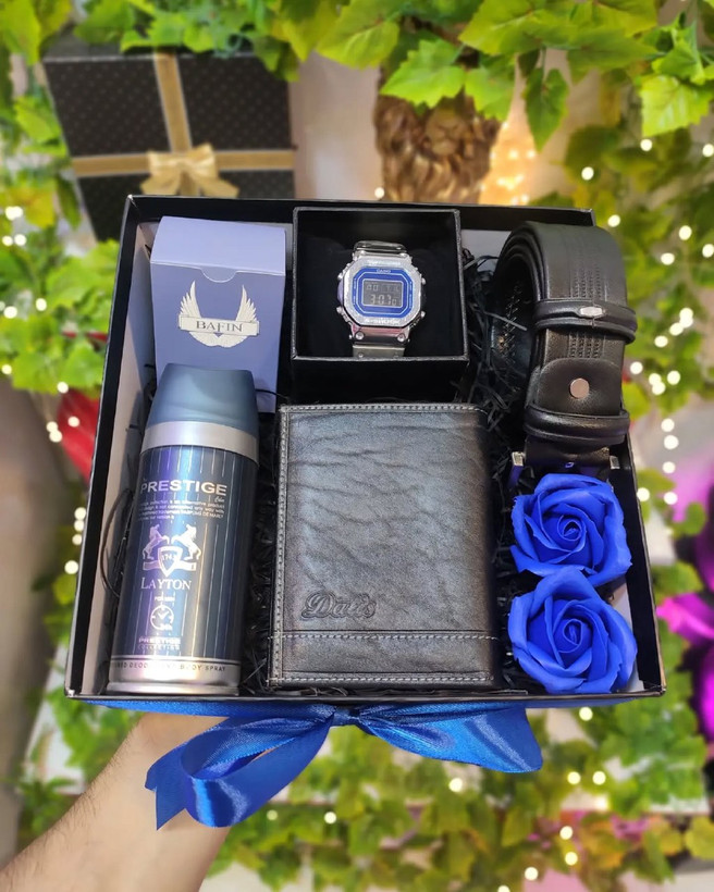 باکس هدیه ساعت و ست چرم و اکسسوری مردانه | کادو ولنتاین و تولد و روز معلم