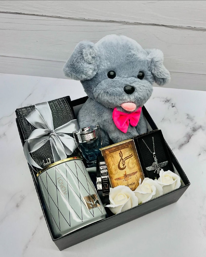 باکس هدیه عروسک و کیف پول چرم و اکسسوری مردانه و پسرانه | کادو ولنتاین و تولد