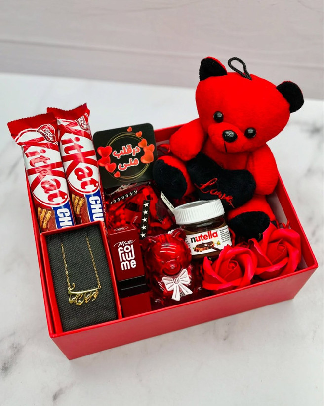 باکس هدیه گردبند و خرس و شکلات زنانه و دخترانه | کادو ولنتاین و تولد و روز دختر