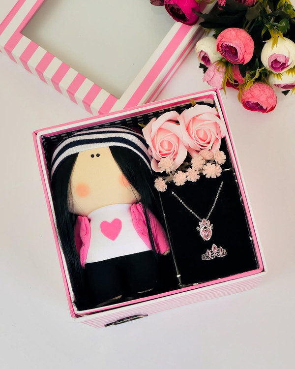 باکس هدیه گردنبند و انگشتر و عروسک دخترانه | کادو تولد و روز دختر