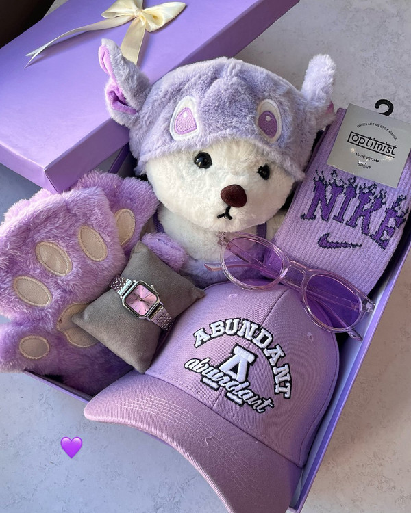 باکس هدیه خرس و اکسسوری تم بنفش دخترانه | کادو تولد و روز دختر