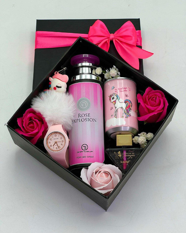 باکس ساعت و اکسسوری تم صورتی دخترانه | کادو تولد و روز دختر
