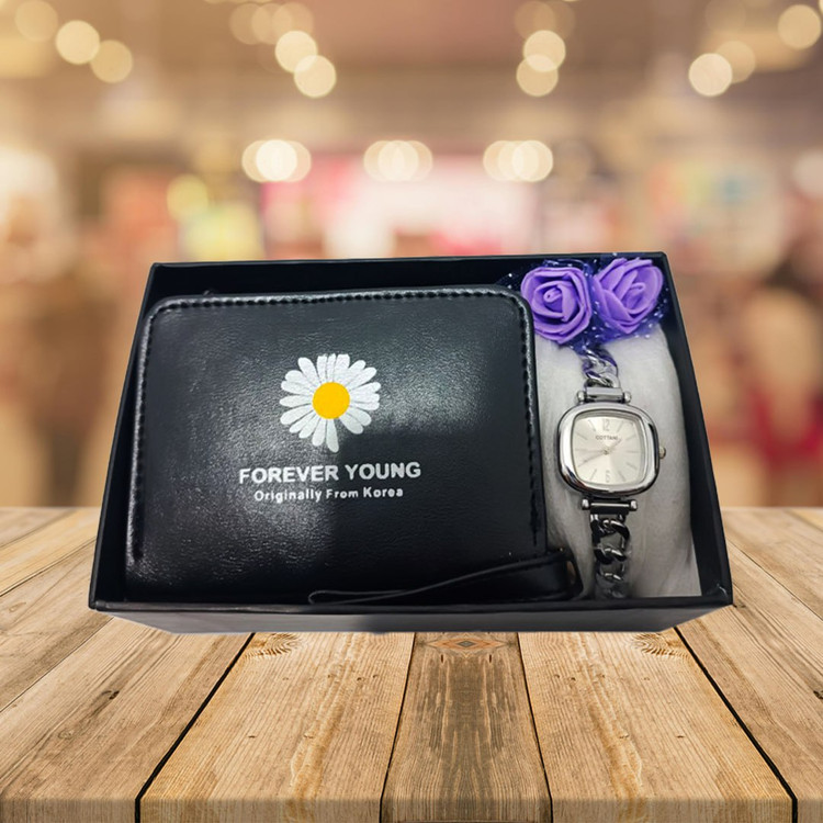 باکس هدیه ساعت و کیف پول طرح بابونه زنانه | کادو تولد و روز معلم، سالگرد ازدواج