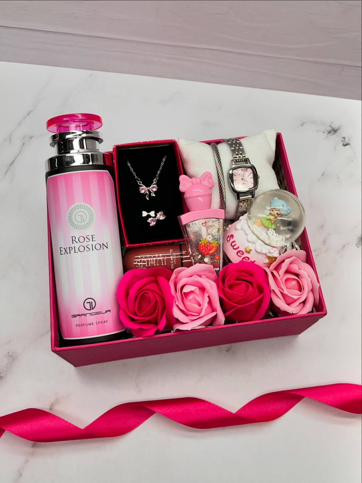 باکس هدیه ساعت و دستبند و اکسسوری ست صورتی دخترانه