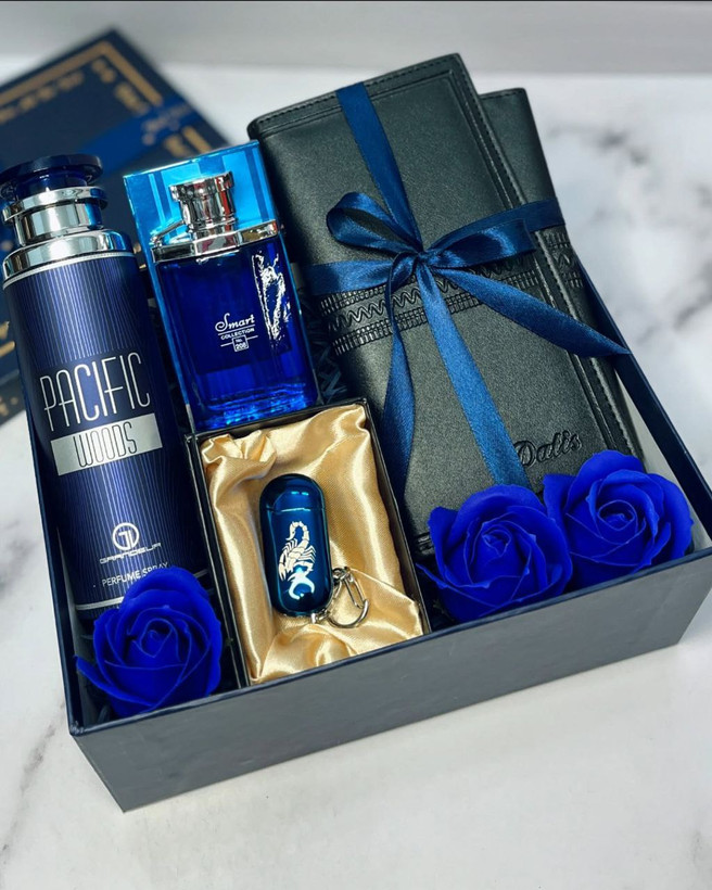 باکس کیف پول و فندک و ست اکسسوری آبی مردانه | هدیه تولد و روز پدر