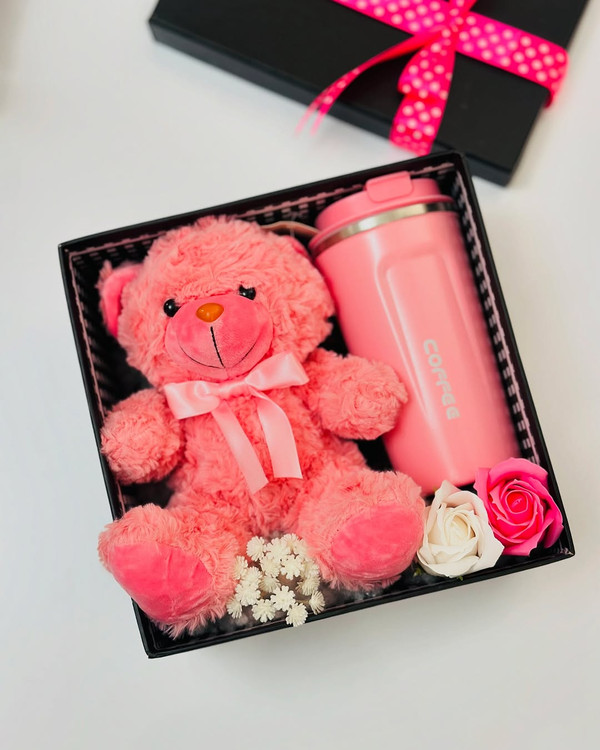 باکس هدیه خرس و تراولماگ دخترانه | کادو تولد و ولنتاین
